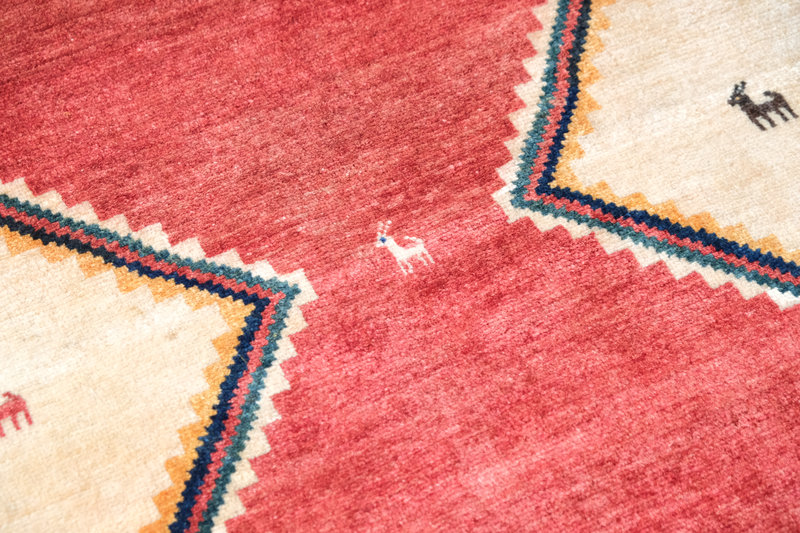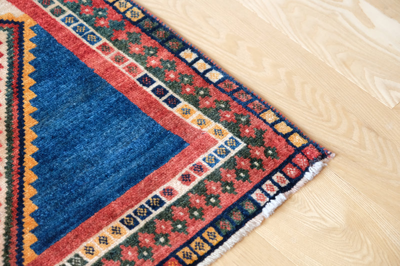その傍らに佇む小さな羊の文様が、ギャッベらしい素朴さと家族の安らぎを感じさせます。