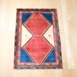 燃えるような赤と深い青、そして砂漠を思わせるアイボリーのコントラストが鮮やかです。